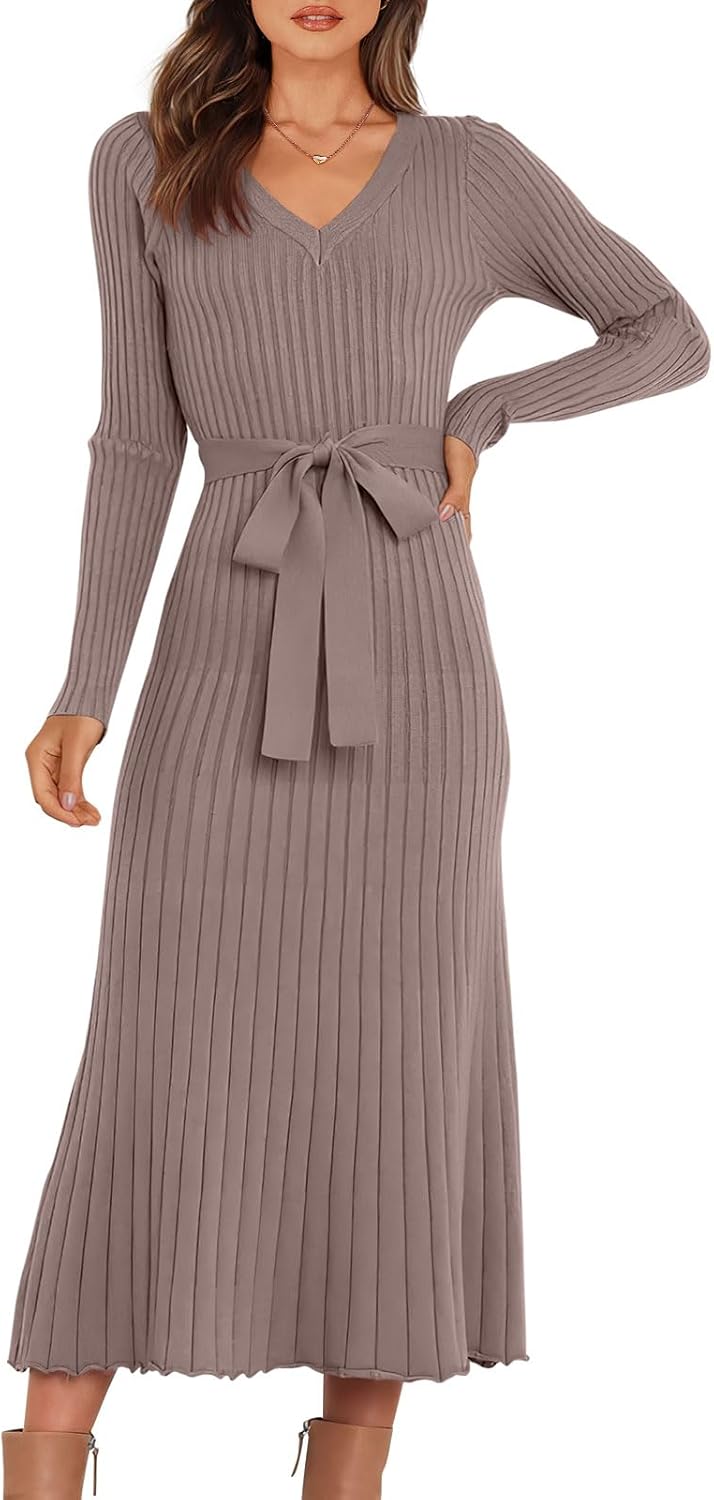 Womens Long Sleeve Fall Dress 2025 V Neck A-line Tie Waist Ribbed Knit Bodycon Midi Sweater Dresses