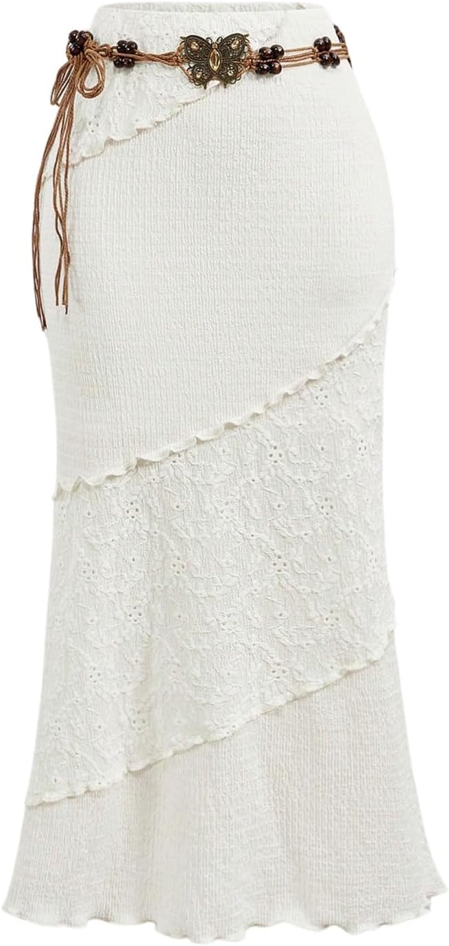 Women’s Y2K Summer Boho Bodycon Long Skirts Crochet Knitted Lettuce Trim Midi Skirt with Belt